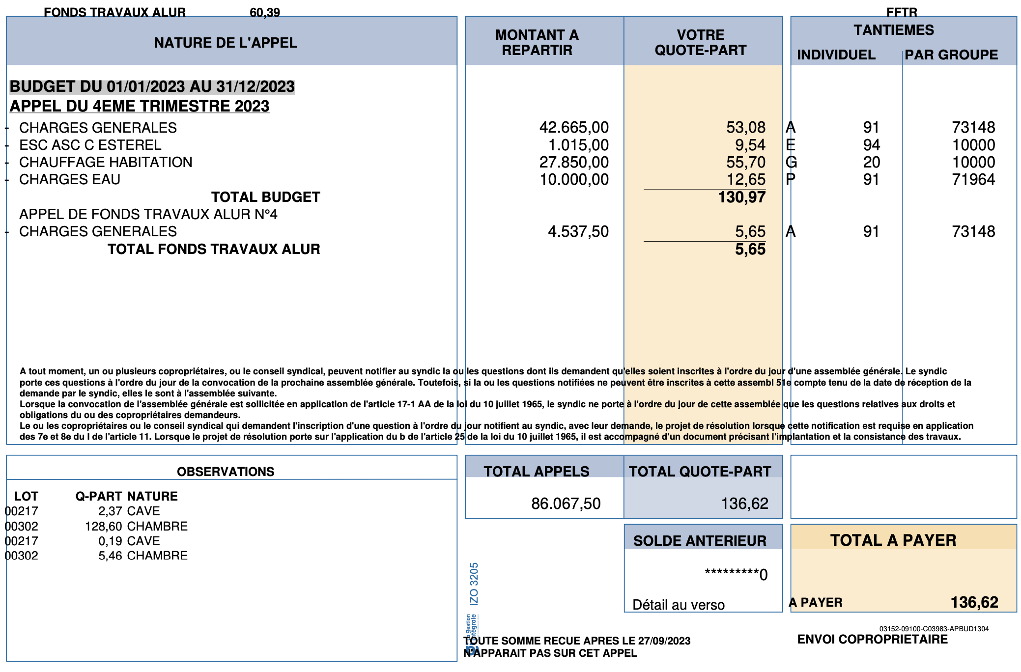 Un montant spécifique est souvent alloué pour les travaux de rénovation ou d'amélioration de l'immeuble. Par exemple, "Fonds travaux ALUR : 60,39 € - Quote-part : 5,65 €" signifie que sur ce fonds total, vous devez contribuer 5,65 €.